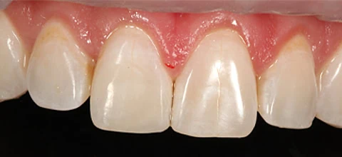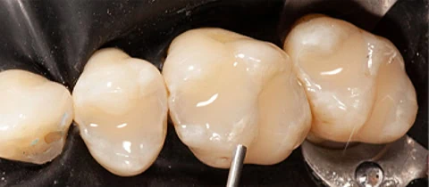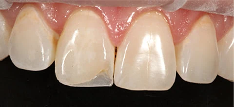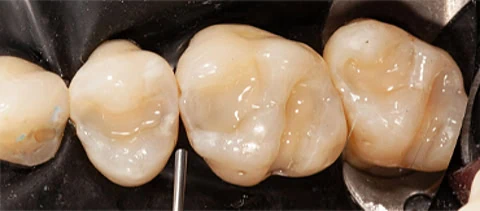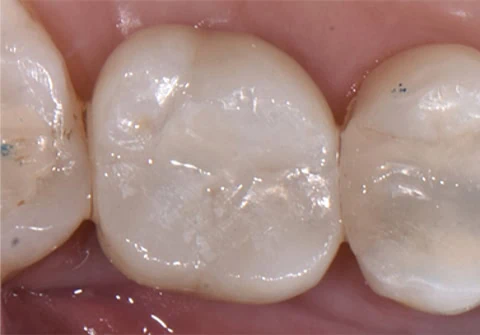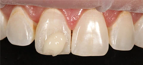 OMNICHROMA BLOCKER thickness depends on the case. The standard is 0.5 – 1 mm, just enough to mask the discoloration. For an opaquer result, layer OMNICHROMA BLOCKER slightly thicker. For a more translucent result, layer OMNICHROMA BLOCKER slightly thinner. Once the OMNICHROMA BLOCKER is placed, OMNICHROMA will shade match the tooth as if bonded to natural enamel.