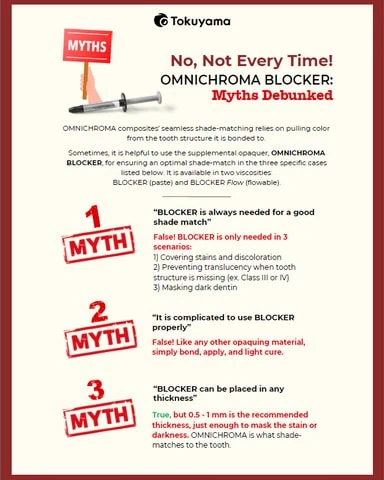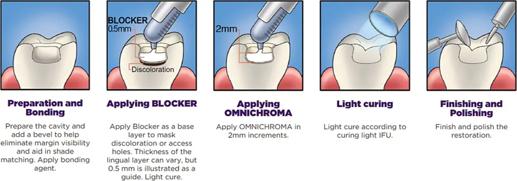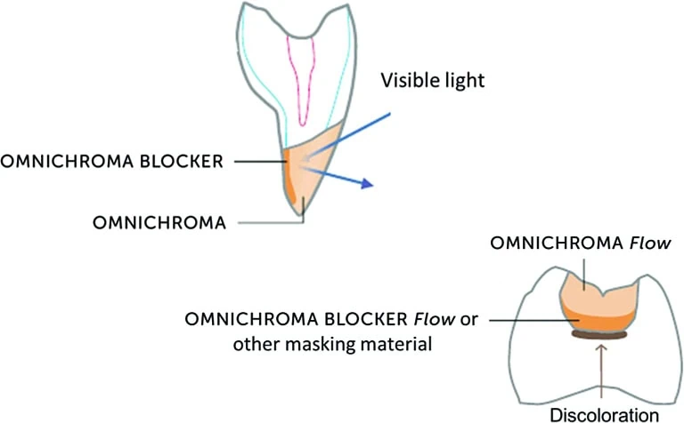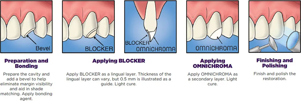 OMNICHROMA BLOCKERs are resin composites with pigments & dyes added to supplement opaquing. All etching and bonding protocols remain the same when using OMNICHROMA BLOCKERs.